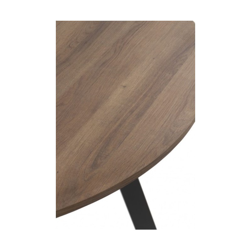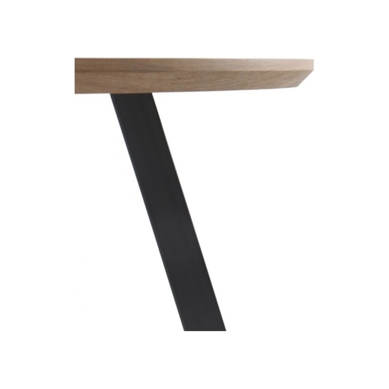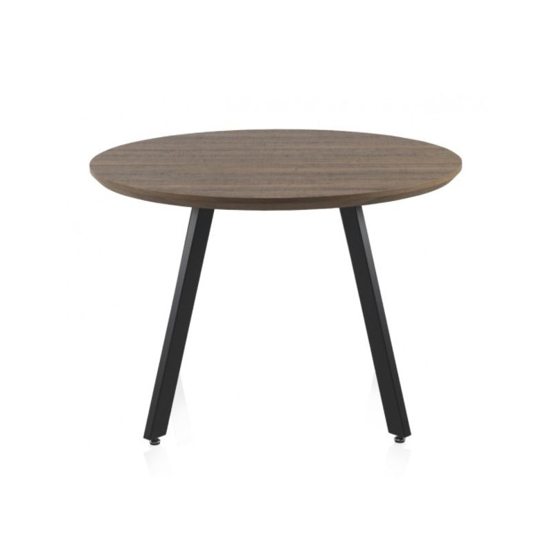 Mesa de Comedor 10309. Mesa fija redonda de 110 cm de diámetro con tapa de madera acabado efecto roble, con un grosor de 4 cm que le aportara dureza y resistencia. Una mesa de estilo moderno que crea un contraste perfecto con las patas de metal color negro.
