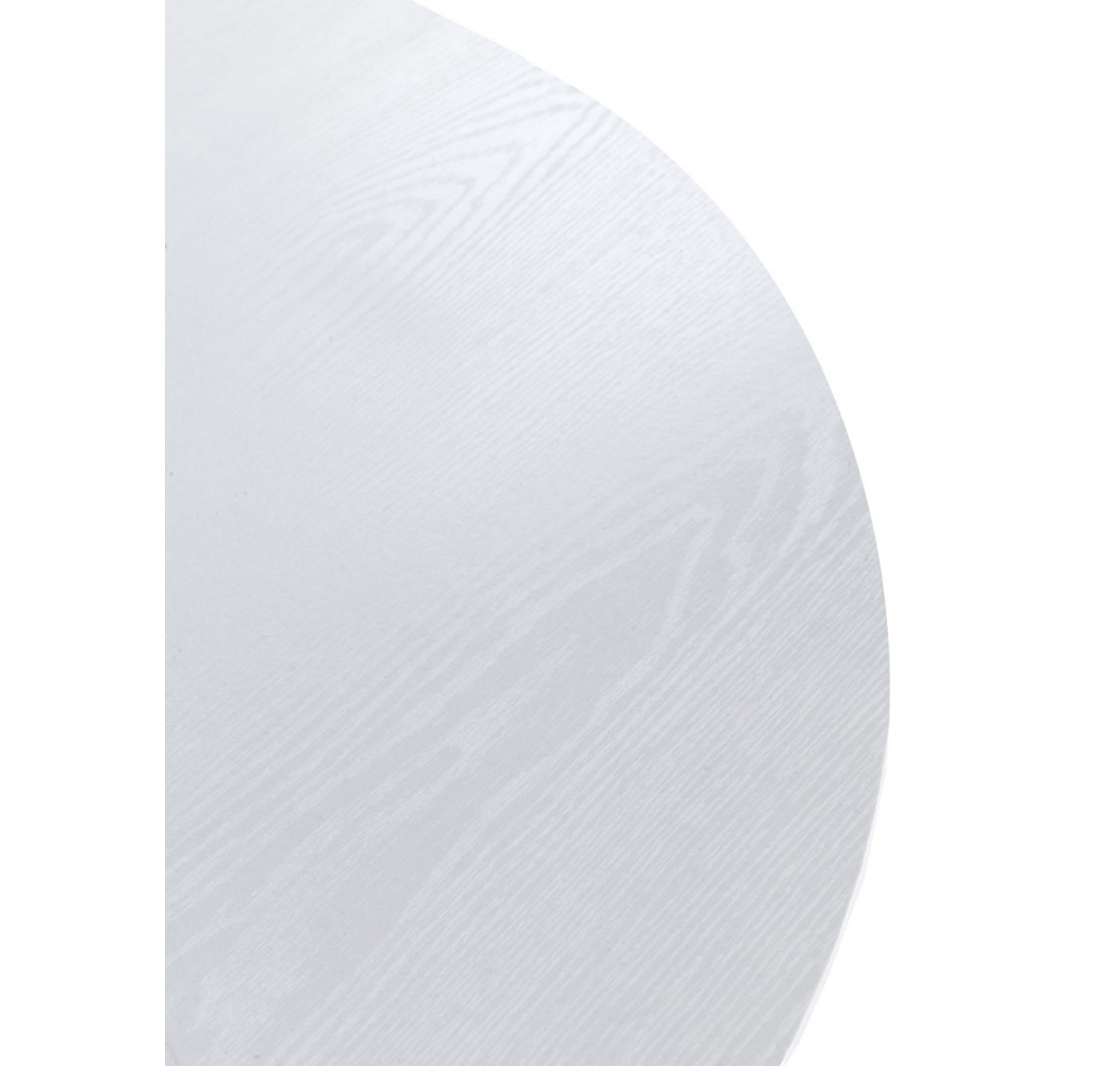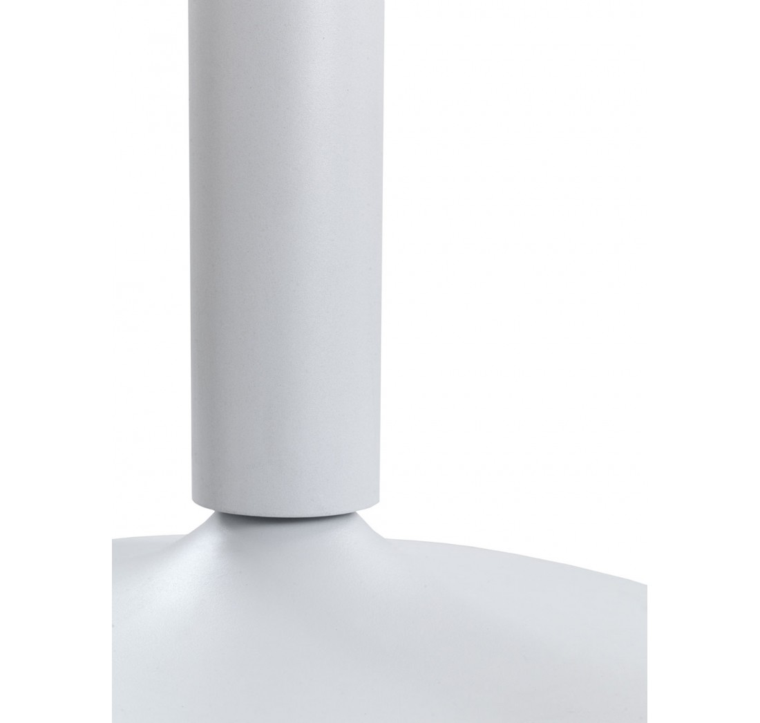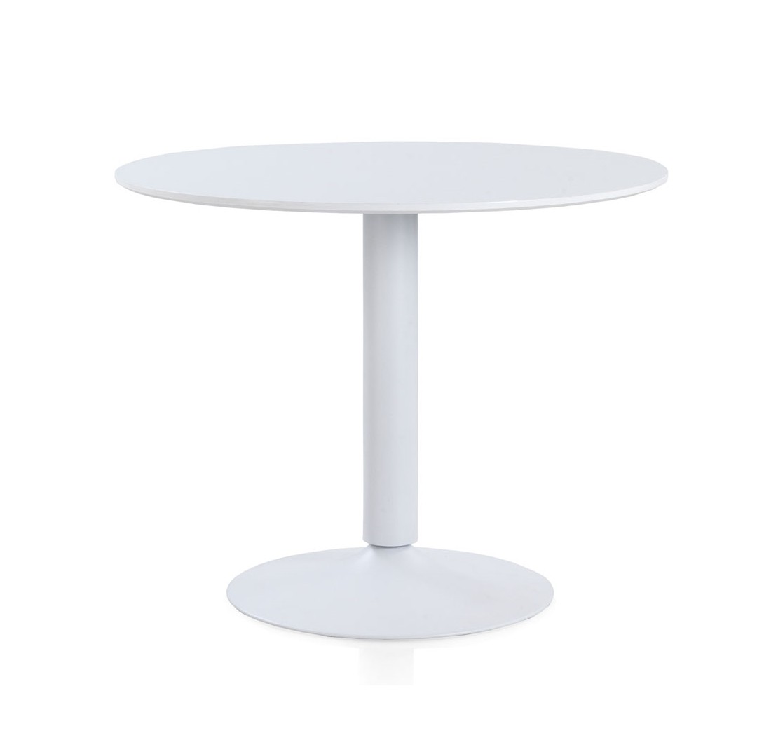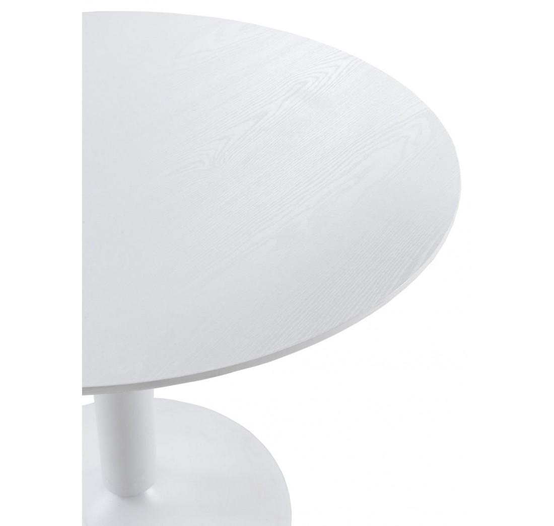 Mesa de Comedor 8397. Mesa fija redonda de 100 cm de diámetro con tapa de madera acabado en color blanco veteado, con un grosor de 2,5 cm que le aportara dureza y resistencia. Una mesa de estilo moderno que crea un contraste perfecto con un pie central de acero en color blanco.