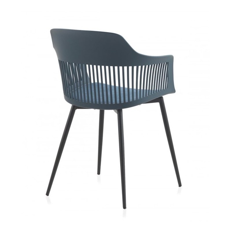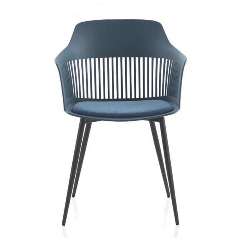 Silla 8202 de Gabar es una silla de estilo nórdico y con un original y novedoso diseño. Esta silla está fabricada de polipropileno y asiento acolchado con cojín en tela de algodón y poliéster en color azul. Sus patas tubulares y ligeramente inclinadas hacia fuera para darle más estabilidad y resistencia son metálicas pintadas de color negro.