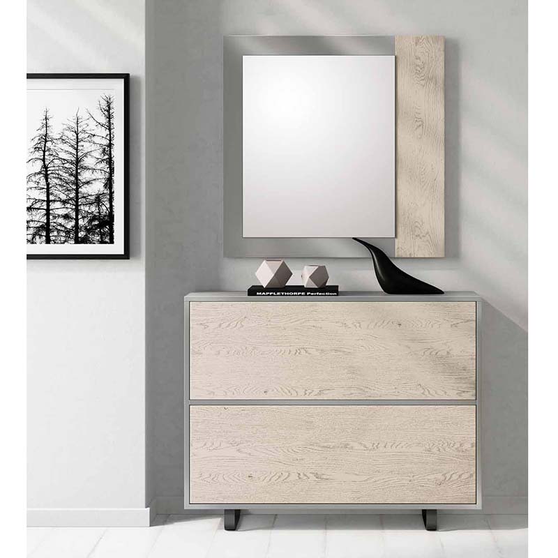 El Recibidor 3000 de Disemobel es un mueble chapa natural y lacado de gran calidad. Fabricado en chapa natural de roble o DMF lacado. De la Consola los frentes las puertas en color Polar y el resto de la estructura en color Plata. El Espejo el lateral derecho en color Polar y el resto en color Plata. Las patas metálicas en color Blanco o Negro.