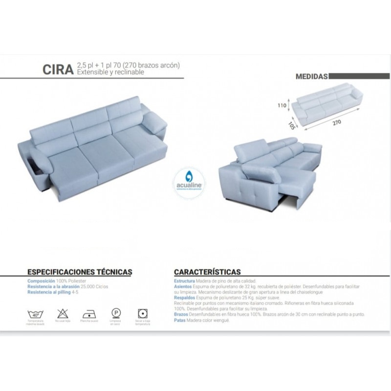 Sofá Cira de Tapìzados 2002. Sofá desenfundable, tapizado con tela Acualine de alta resistencia. Con estructura de madera de pino, asientos de espuma de poliuretano y respaldos de fibra hueca siliconada.